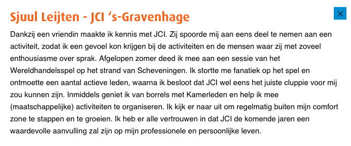 “Ik kijk er naar uit om regelmatig buiten mijn comfortzone te stappen en te groeien. Ik heb er alle vertrouwen in dat JCI de komende jaren een waardevolle aanvulling zal zijn op mijn professionele en persoonlijke leven.”